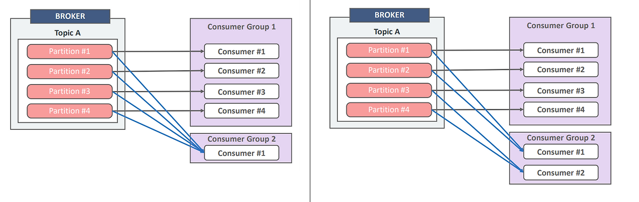 - Group 1의 Consumer들은 A #1, A #2 파티션을, Group 2의 Consumer는 A #1, A #2파티션을 각각 할당받아 데이터를 읽는다. 서로 다른 그룹이므로 동일한 파티션(예: Partition 0)을 두 그룹의 Consumer(Group A의 Consumer와 Group B의 Consumer)가 동시에 읽을 수 있음을 보여준다.