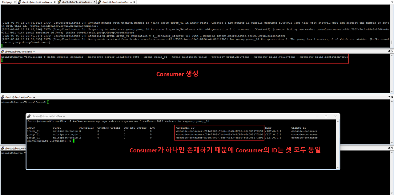 - Consumer를 1개만 실행하더라도, 이 Consumer는 자동으로 자신의 Consumer Group(예: `group.id`로 지정된)에 속하게 된다. 이 경우 하나의 Consumer가 해당 토픽의 모든 파티션을 담당하게 된다.
