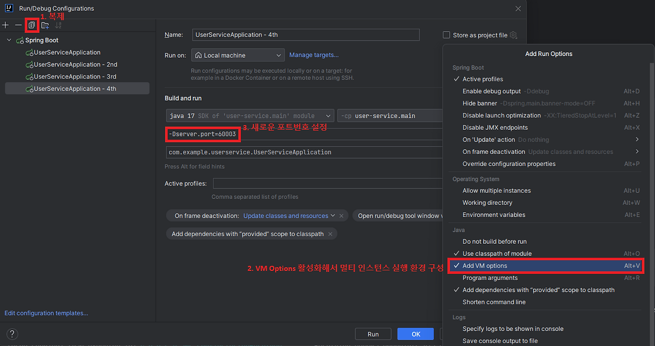 - User Service를 2개 이상의 인스턴스로 실행 (예: 60001, 60002 포트)
