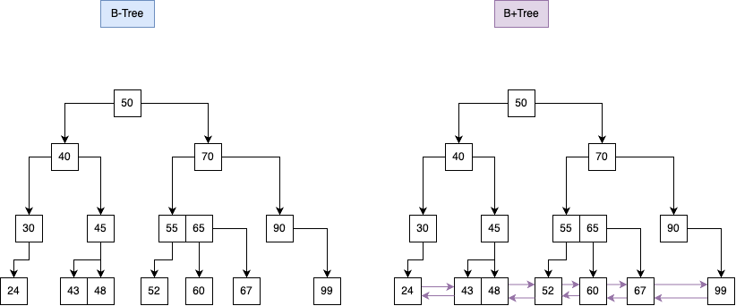 - 데이터 저장 방식: B-Tree는 모든 노드에 실제 데이터의 주소값을 저장하는 반면, B+ Tree는 오직 리프 노드에만 실제 데이터를 저장한다. 이로 인해 중간 노드(Internal Node)의 메모리 효율이 높아져 하나의 페이지에 더 많은 인덱스 키를 담을 수 있고, 결과적으로 트리의 높이를 더 낮게 유지할 수 있다.