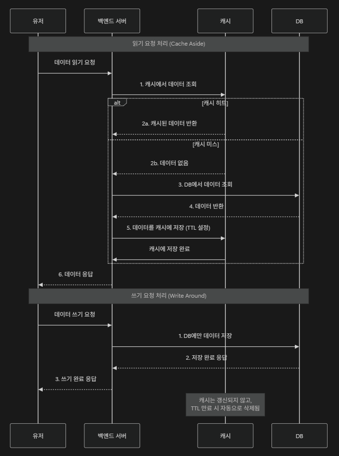 - 읽기: 캐시를 우선 조회하고, 미스 발생 시 DB에서 가져와 캐시에 저장한다.