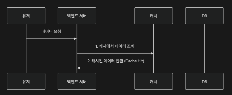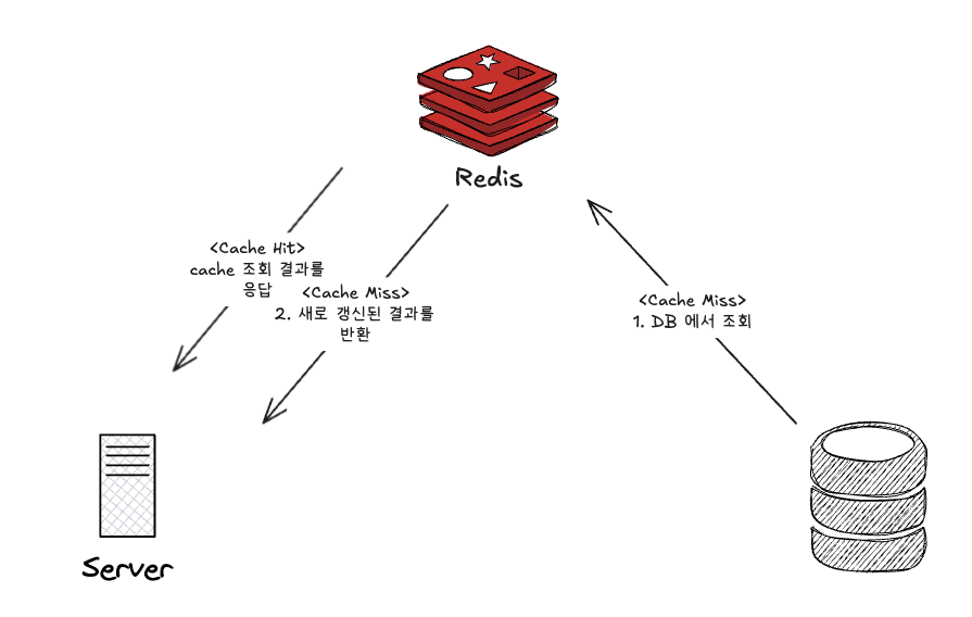 - Cache Miss: 데이터가 없다면 DB에서 데이터를 조회한 후, 이를 캐시에 저장하고 반환한다