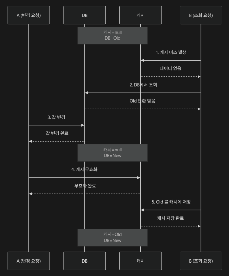 변경 요청 직후 무효화가 완료되기 전, 아주 짧은 찰나에 조회 요청이 들어오면 유저는 여전히 Old 데이터를 받게 된다.