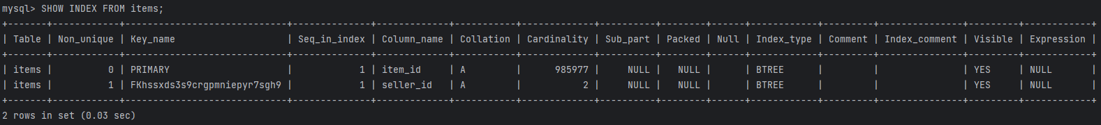 인덱스 상태 확인을 위해 아래와 같이 `SHOW INDEX FROM items;` 쿼리를 수행