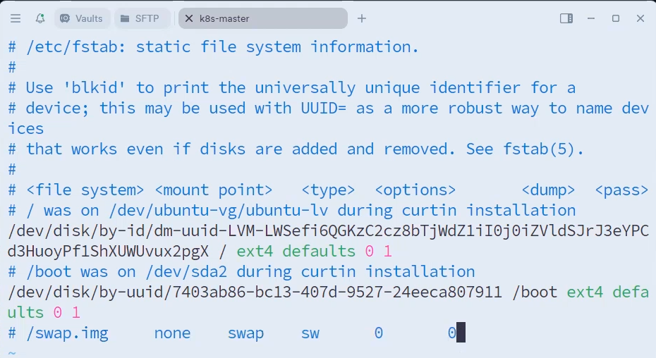 sudo vi /etc/fstab # swap 항목 주석처리