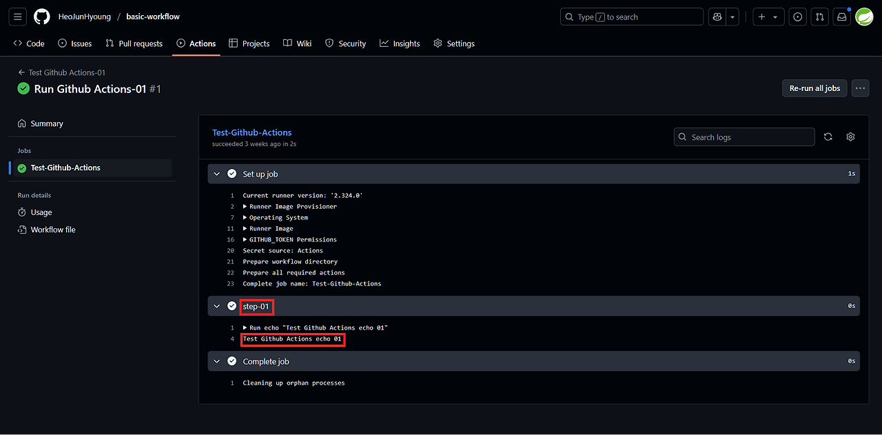 | Job과 Step 정의 | checkout Action 사용, echo 명령어 실행 |
